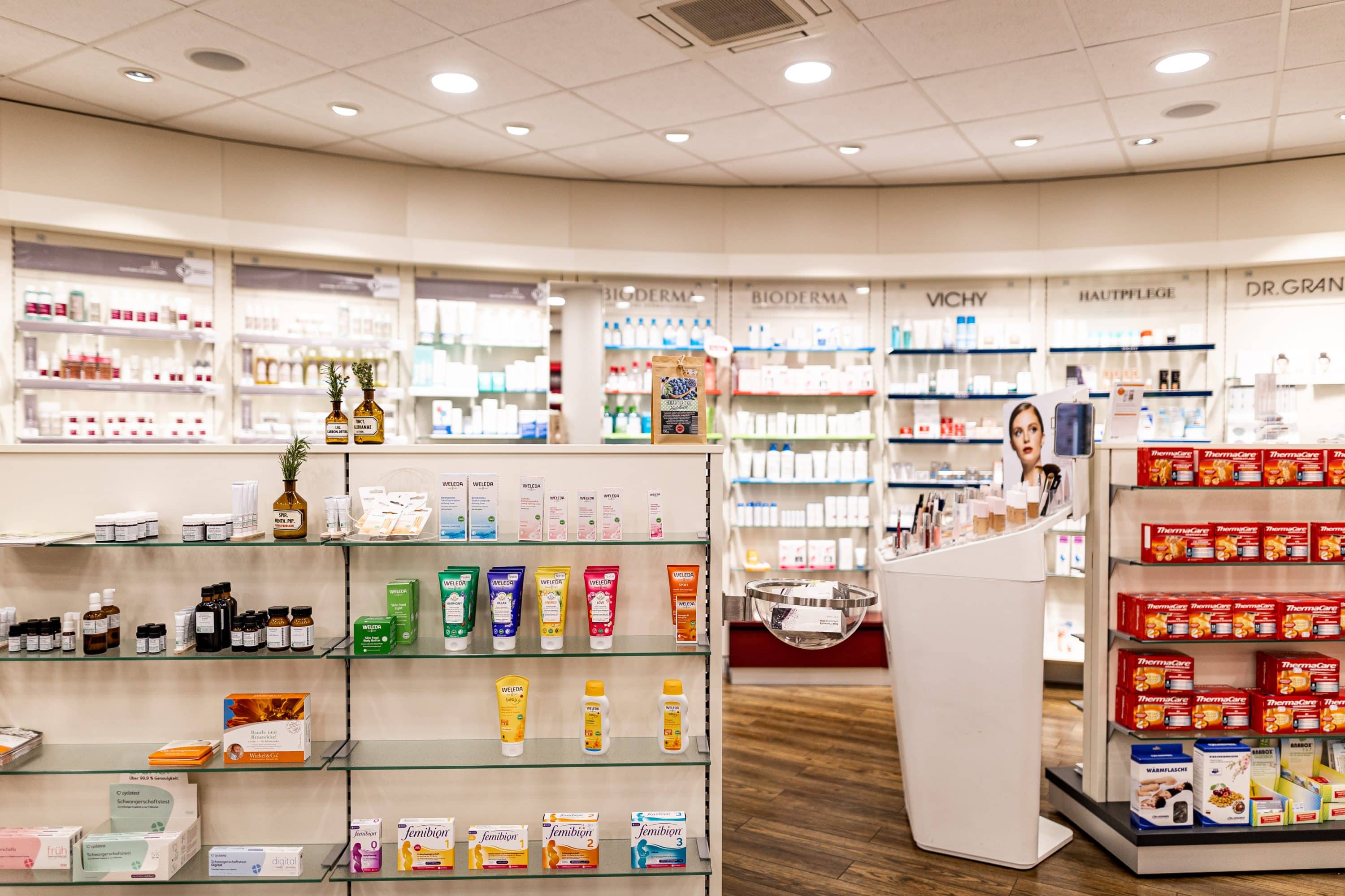 Die Produkte der Apotheke am Dombogen reichen von klassischen Arznei- und Hilfsmitteln über naturzertifizierte Kosmetik, Produkte der integrativen Therapie bis hin zu Reise- und Kompressionsstrümpfen.